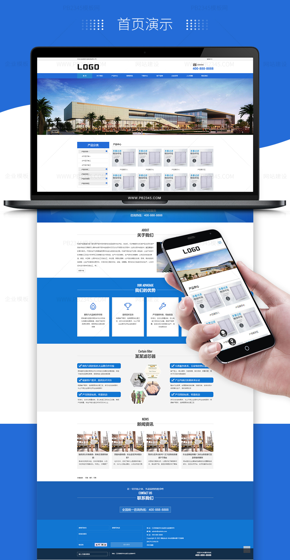 该模板由PbootCMS内核开发,适用于通用机械、滤芯过滤器等企业网站,也适用于其他行业,只需将文字图片更换即可。